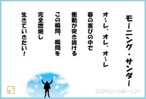 モーニングサンダー 2026/4/14 2026/4/14 2026, 詩集 オ~レ、オレ、オ~レ春の喜びの中で衝動が突き抜けるこの瞬間、瞬間を完全燃焼し、生きていたい! らいふあーと21~僕らは地球のお世話係~