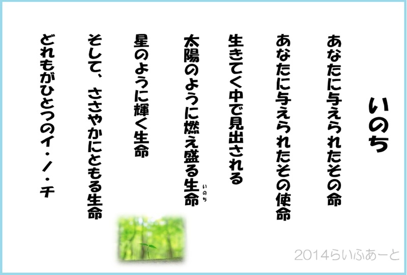 いのち 2025/12/16 2025/12/16 2014, 詩集 あなたに与えられたその命あなたに与えられたその使命生きてく中で見いだされる太陽のように燃え盛る生命(イノチ)星のように輝く生命そして、ささやかにともる生命どれもがひとつのイ・ノ・チ らいふあーと21~僕らは地球のお世話係~